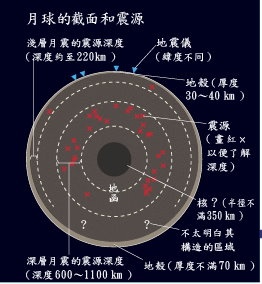 藤村參事說:“月球的地震有以深度大約到220公里為震源的『淺層月震』,以及以深度600公里~1100公里為震源的『深層月震』”。由于月球半徑大約是1738公里,所以深層月震的震源相當靠近月球中心。至于地球,半徑大約6378公里,地震的震源最深大約670公里。